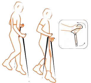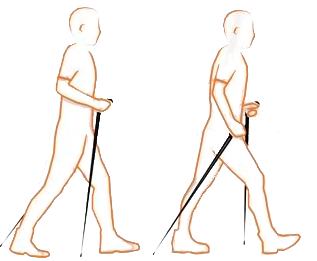 NO TERRENO PLANO: O bastão deve estar ajustado adequadamente com o seu braço que ao segura-lo apoiado ao chão seu braço deve estar na horizontal, com 90º. Balance os braços no ritmo normal, colocando os bastões à frente. Pisada direita com bastão Esquerdo à frente, e vice versa.
