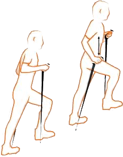 Preste atenção no balanço dos braços com os bastões. Sempre tente manter seu centro de equilíbrio na coluna(veja-se ilustração à esquerda). No plano, fique ereto, com o bastão passando do seu lado e não jogue o corpo para frente desnecessariamente. É mais fácil manter um poste em pé, se ele estiver sem inclinação. Se inclinar, faz mais força, desbalanceia as juntas, e traz sobrecarga, desgaste, dor e inchaço nas articulações.